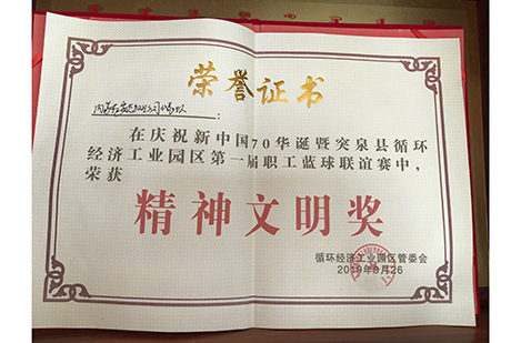 在慶祝新中國70華誕暨突泉縣循環(huán)經(jīng)濟(jì)工業(yè)園區(qū)第一屆職工籃球聯(lián)誼賽中,榮獲“精神文明獎”